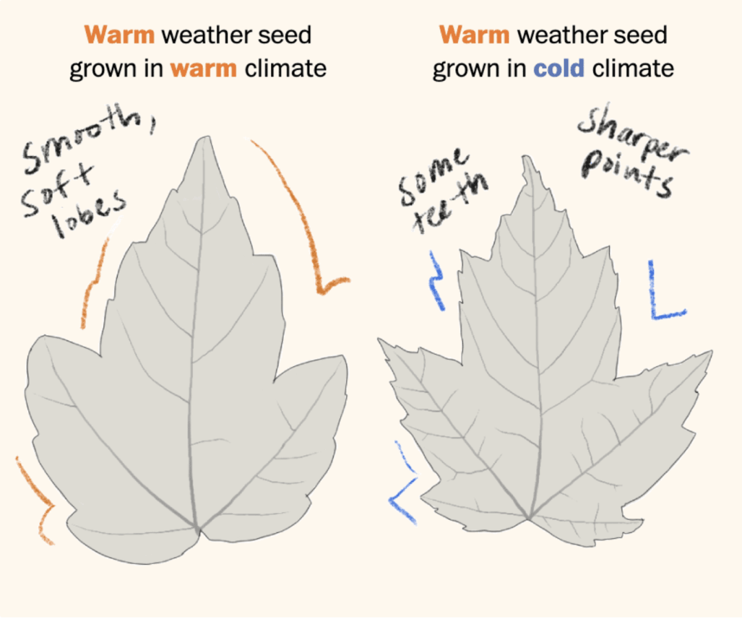 Seeds from the same tree grown in different climates create differently shaped leaves. Illustration by Leslie Shapiro