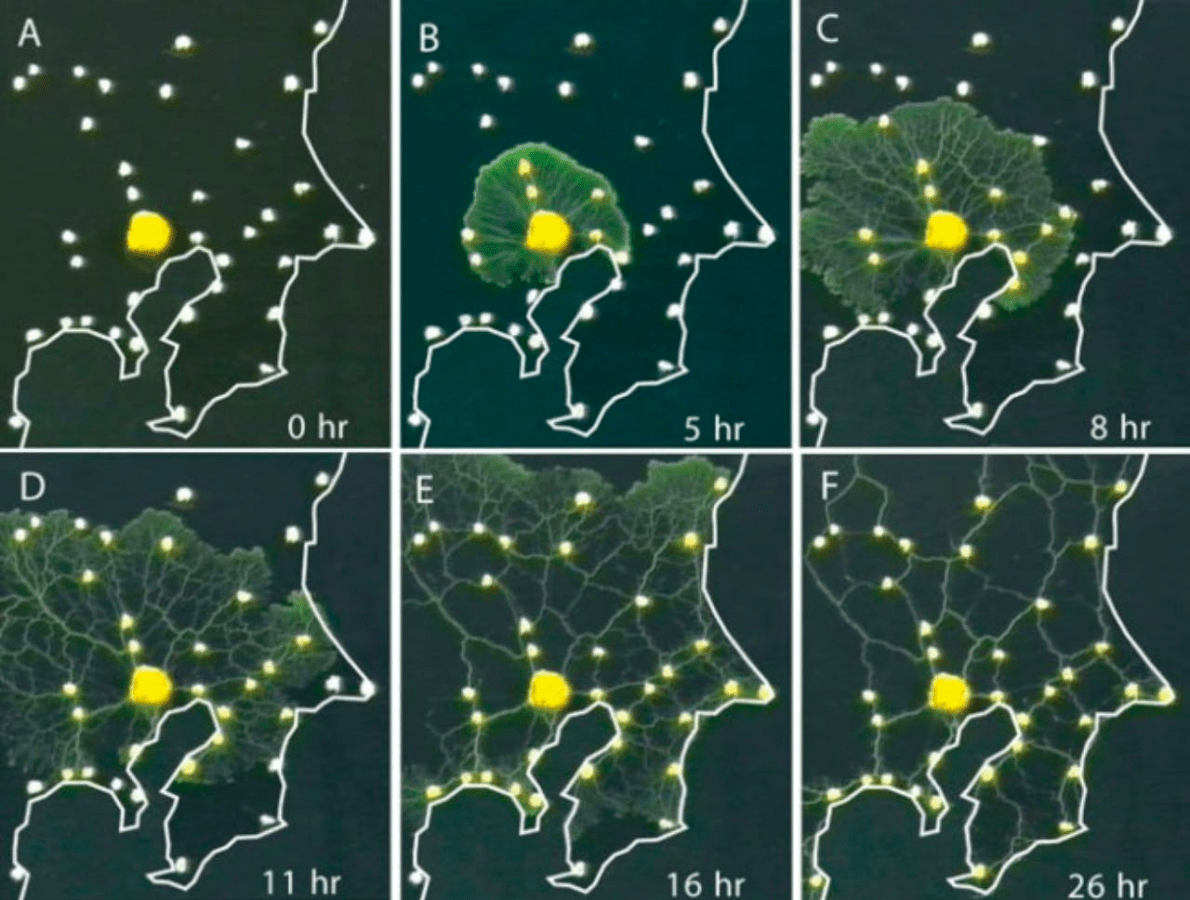 Scientists created tiny replicas of major cities like London and Tokyo. The railway or subway stations are represented by pieces of oatmeal. As the slime mold “travels” through the replica, it naturally finds the most efficient route. It will explore areas between pieces of oatmeal, doing quick trials to see what route is more efficient. It seems to remember what routes it’s tried in the past that didn’t work, and then continues reinforcing the most efficient route. In doing this, the mold basically mapped out the Tokyo subway system… in just over 24 hours. Think about this for a minute. It takes a slime mold a little more than a day to settle on a the most efficient route within the replica.